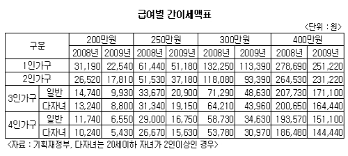 임금동결 분위기가 확산되면서 올해 김 대리의 연봉은 지난해와 같은 3000만원이다. 하지만 올해 김 대리의 원천징수 세금을 뗀 월급은 지난해보다 1만2190원 늘어난다. 월급여가 250만원이고 자녀 2명을 둔 3인가구 근로자의 원천징수 세금이 3만1340원에서 1만9150원으로 줄어들었기 때문이다.