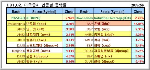 지난 주말의 미국증시도 경기부양대책 합의발표와 금융시스템 안정화 기대감을 반영하여 상승했다. 그동안 폭락한 은행업종이 큰 폭으로 반등하는 등 차, 철강, 건설, 항공 등 많이 내렸던 업종의 상승폭이 컸다. 특히, 기술업종의 경우는 반도체, LCD, Mobile, Computer 업종의 턴어라운드 기대감과 함께 추세적 반등양상으로 발전하고 있다.