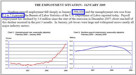 지난 주에 발표된 경지지표 중 미국의 실업율이 주목을 끌었다. 대공황 이후 최악이라는 경제여건이니 실업율이 증가하는 것은 어쩔 수 없다. 비농업부문의 일자리가 598,000개 줄어 들면서 실업율은 지난 달의 7.2%에서 7.6%로 증가한 것으로 발표되었다. 참고로 대공황당시의 실업율 최고치는 25%였으니 아직은 그 정도와 비교하는 것은 비약이다.