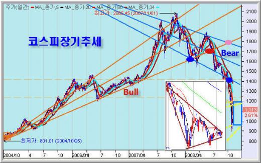 코스피의 장기추세는 시스템이 망가진 정도의 상황이다. 수렁에서 힘들게 빠져나오려는, 베어마켓도 아닌 비정산적인 상황이란 것이다. 단기추세는 지난 주 금요일날 매수신호가 출현한 후 순항중이다. 어슬픈 입살들이 투자를 망치게 한다는 유명한 월스트리트의 격언대로 그 많은 입살들이 개인매물을 쏟아내게 하고는 지수는 꿋꿋하게 상승하고 있다. 에너지의 밀집대를 구획한 다음 한 칸까지 진행되면 드디어 베어마켓으로 접어든다.