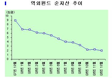 14조원에 육박했던 역외펀드 순자산은 2007년 11월말 다시 10조원 대 밑으로 떨어졌고, 지난해 5월에는 5조원 대까지 급락했다.