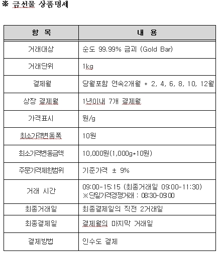 가격은 1g당 원화로 표시하며, 최소가격 변동폭은 10원이다. 따라서 계약당 최소가격 변동금액은 1만원(10원×1000g)이다. 상장결제월은 해당월을 포함한 연속2개월 및 짝수월로 1년내 7개 결제월이 있다.
