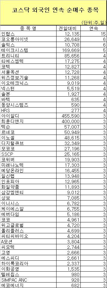 [표]코스닥 외국인 연속 순매수 종목-16일