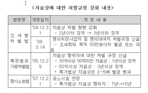 한편 50억원 이상 자료상 행위자는 3년이상의 징역 등에 처해지며 특가법상 자료상은 2~5배의 벌금이 병과된다. 지난해에는 1521명이 자료상 행위로 1조491억원의 벌금을 부과받았다.