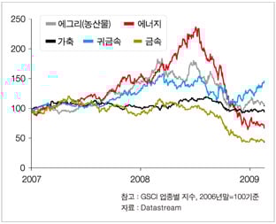 삼성증권에 따르면 원자재 가격은 지난 2004년 이후부터 장기 상승국면에 돌입했으며 2008년 중반을 정점으로 꺾인 것으로 분석된다. 대부분의 원자재 가격은 2004년 상승사이클에 돌입하기 이전 가격으로 돌아왔다.