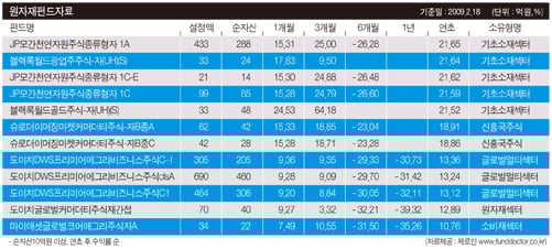 최근 원자재 펀드 수익률은 다른 펀드에 비해 두드러진다. 올 들어 2월18일까지 가장 높은 수익률을 보인 원자재펀드(순자산 10억원 이상)는 ▲JP모간천연자원주식종류형자 1A ▲블랙록월드광업주주식-자(UH)(S) ▲JP모간천연자원주식종류형자 1C-E 등으로 22%가량 수익률을 올렸다.