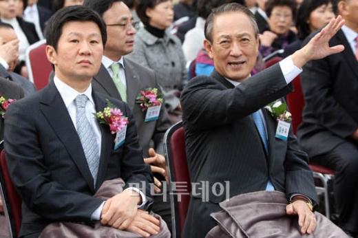 김승유 하나금융그룹 회장(우측)과 정몽규 현대산업개발 회장이 2일 오후 서울 은평구 뉴타운내에서 열린 서울시 최초의 자립형 사립고인 하나고등학교 기공식에서 담소를 나누고 있다.