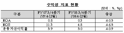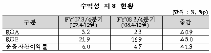 이에 따라 총자산이익률(ROA)과 자기자본이익률(ROE) 모두 0.5%포인트와 6.5%포인트 하락한 0.3%와 4.8%에 그쳤다. 주가 급락에 따라 운용자산이익률도 0.9%포인트 떨어진 5%를 기록했다.