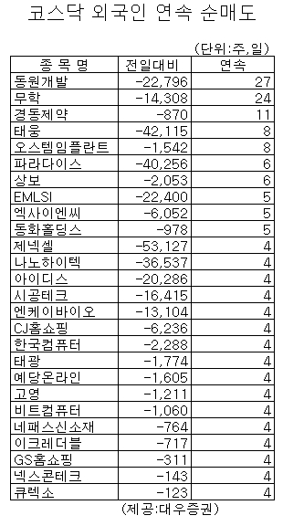 [표]코스닥 외인 연속 순매도 종목-25일