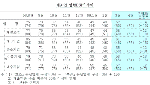 한국은행이 최근 2169개 제조업체를 대상으로 조사해 31일 발표한 '2009년 3월 기업경기조사 결과'를 보면 제조업의 3월 업황 기업경기실사지수(BSI)는 57를 기록, 11년만에 최악의 수준으로 떨어졌던 전달(43)에 비해 14포인트 올랐다.