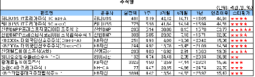 주간 수익률 상위 펀드는 '하나UBS IT코리아주식1클래스A'(5.19%), '신한BNPP 프레스트지코리아테크주식2'(5.14%), 'KB 2000시대외국인선호주주식클래스A'(4.93%) 등 IT업종과 대형주에 투자하는 펀드의 성과가 뛰어났다. 또 중소형주 강세에 힘입어 '하이 중소형주플러스주식1-Ci'와 '동양 중소형고배당주식1'도 각각 주간 수익률 4.74%, 4.17%를 기록해 최근 호조세를 이어갔다.