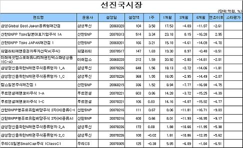삼성투신운용의 ‘삼성Global Best Japan종류형재간접’이 3.58%의 수익률로 평가 대상 펀드 중 가장 우수한 성과를 기록했고, 신한BNP자산운용의 ‘신한BNPP Tops일본대표기업주식 1A’과 ‘신한BNPP Tops JAPAN재간접 1’도 3%대의 상대적으로 높은 수익률을 올렸다.
