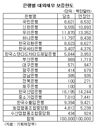정부가 은행의 대외채무 지급보증 기한을 올해말까지 연장하면서하나은행에 대한 보증한도를 당초보다 30억 달러 이상 줄였다. 반면 우리은행과 신한은행은 각각 10억달러 이상 늘렸다.