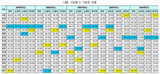 분석 결과 16개 시도 중에는 광주 지역이 5개 학년도 대부분의 영역에서 상위권(1~4등급) 비율이 가장 높은 것으로 나타났다. 인천, 충남, 전북 지역의 1~4등급 비율이 30%대를 기록한 반면 광주 지역은 대부분 50%를 넘어 20%포인트 정도의 격차를 보였다.