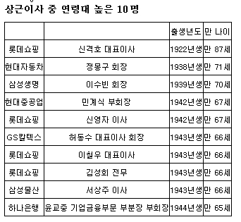 상근 이사 중 최고령자 임원은 롯데쇼핑 신격호 대표이사로 1922년생 만87세였다. 이어 △현대·기아자동차 정몽구 회장 (1938년생, 만 71세) △삼성생명 이수빈 회장 (1939년생, 만 70세) 순이었다. 상근 이사 중 연령이 가장 낮은 임원은 △S-OIL 이언주 상무(1972년생, 만37세) △LG전자 김승표 상무 (1972년생, 만 37세)인 것으로 조사됐다.
