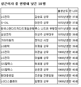 반면, 나이가 가장 어린 임원은 최고령자인 신 회장과 50살 차이가 나는 만 37세의 이언주 S-OIL 상무와 김승표 LG전자 김승표 상무였다.
