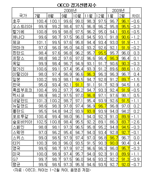 OECD 회원국 평균은 92로 전달보다 0.7포인트 하락했다. 특히 선진 7개국(G7)은 전달보다 0.9포인트 낮아져 향후 경기전망이 어두운 것으로 나타났다.