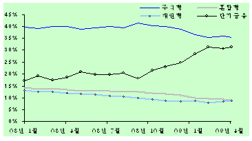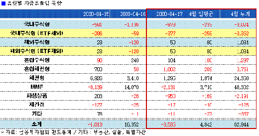 반면 채권형펀드는 이날 1295억원의 자금이 순유입됐다. 이달 들어 하루 평균 1874억원의 자금이 몰리며 안전자산 선호현상이 여전함을 방증했다. 또 초단기 금융상품인 머니마켓펀드(MMF)는 이날 2131억원 순감소했으나 이들 들어 4조8302억원의 뭉칫돈이 몰려 시중 자금의 단기 부동화도 수그러들지 않았다.