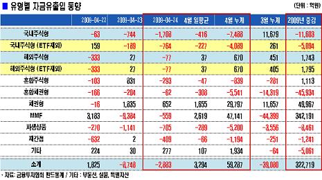 채권형펀드에는 이날도 652억원이 들어와 이틀 연속 자금 유입세를 이어갔다. 반면 MMF(머니마켓펀드)에서는 559억원이 빠져나가 이틀 연속 유출세를 기록했다.