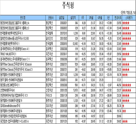펀드별로는 대부분의 펀드가 마이너스 수익률을 기록한 가운데 삼성그룹주펀드와 가치주펀드들의 선전이 돋보였다. ‘동양모아드림삼성그룹주식 1클래스A’와 ‘동양모아드림삼성그룹주식 1클래스C’가 각각 0.28%, 0.27%의 수익률을 기록, 평가 대상 주식형펀드 중 가장 우수한 성과를 올렸다.