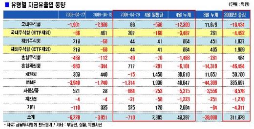 그동안 자금 유입이 계속되던 채권형펀드는 이날 15억원이 순유출됐고, 머니마켓펀드(MMF)에서도 1314억원이 빠져나갔다.
