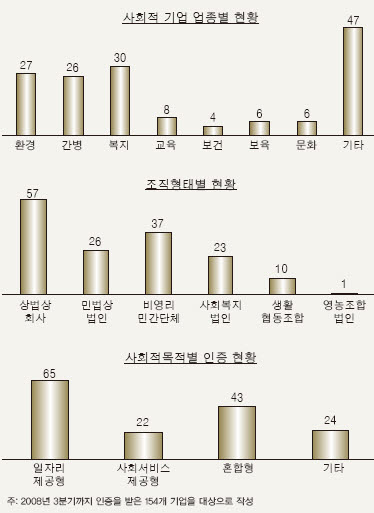 취약점에 대한 평가도 이어졌다. 2008년말 기준으로 노동부가 인증한 사회적기업의 수는 218개다. 2008년 매출액은 465억원, 당기순익은 28억원 정도로 아직 걸음마 단계다.