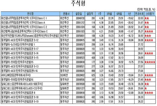 '동부델타-프라임 1단위주식혼합 9'이 3.45%로 혼합형펀드 가운데 가장 선전했고 'SH변동성플러스주식혼합 3'은 3.18%, '동부델타-ACE1단위주식혼합증권 5- 7'은 3.02%의 수익률을 기록했다.