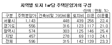 지역별 주택사업자의 이윤은 △서울 22.4% △경기 21% △광역시 25.5% △지방 24.1%로 나타났다.