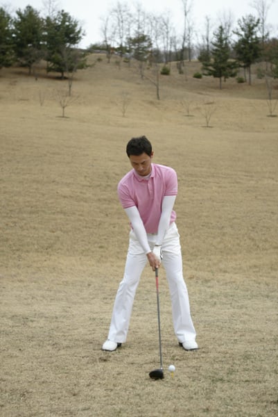 골프스윙은 어드레스에서 오른쪽 어깨가 내려가고 팔을 자연스럽게 뻗어 클럽을 비스듬히 내려놓는 반면 야구스윙은 오른발(오른손 타자의 경우)에 체중을 실어놓고 양팔을 90도 각도로 세운다.