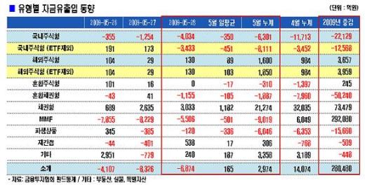 이날 머니마켓펀드(MMF)에선 5506억원이 이탈했고, 혼합채권형펀드와 파생상품펀드에서도 각각 1155억원, 120억원이 빠져나갔다.