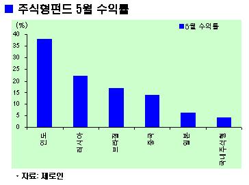 인도와 러시아 등 이머징증시가 차별적인 강세를 보이면서 관련 펀드로 자금이 들어오는 양상이다. 지난 5월 인도펀드가 38%의 수익을 올렸고 러시아펀드(22.2%)와 브라질펀드(17.1%)가 그 뒤를 이었다. 중국펀드와 일본펀드도 각각 14.1%, 6.3% 이익을 거뒀다. 같은 기간 국내주식형펀드는 4.3% 수익을 내는 데 그쳤다(펀드평가사 제로인 자료).