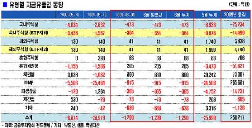 반면 국내주식형펀드에선 연일 자금이 빠져나가고 있다. 국내주식형펀드는 473억원이 이탈해 5일 연속 유출세를 나타냈다. 상장지수펀드(ETF)를 제외한 일반 국내주식형펀드도 364억원이 빠졌다.