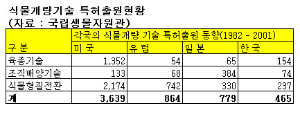 2005년을 기준으로 육종, 조직 배양, 형질 전환 등 국내에서 이뤄진 식물개량과 관련한 기술 특허 출원건수는 465건이지만 미국은 한국의 약 8배인 3639건에 이른다. 일본과 EU의 관련 특허도 각각 779건과 864건으로 한국을 크게 앞서 있다.