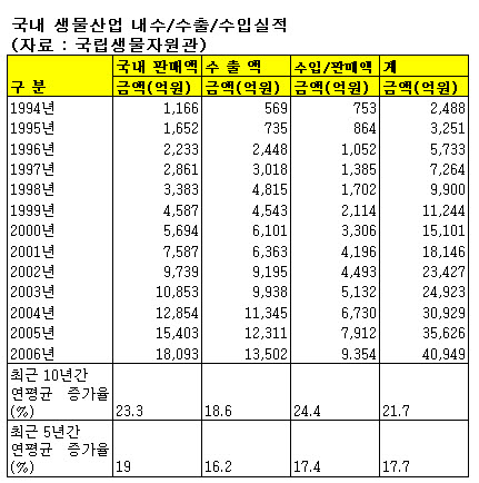 내수 규모가 1조8000억원에 달하고 수출 규모도 1조3500억원에 이른다. 생물자원을 활용한 제품에 대한 수입 규모도 9354억원으로 적지 않다. 하지만 한국의 생물산업 규모는 아직 주요 선진국에 비해서는 영세한 편이다.