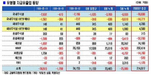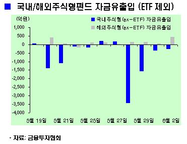 상장지수펀드(ETF)를 제외한 일반 국내주식형펀드도 272억원이 이탈했다. 유출폭이 줄긴 했지만 연 4일째 자금이 빠지고 있다.