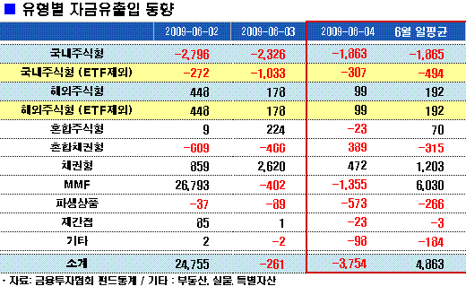 국내 주식형펀드 수탁액은 지난 3일 전날보다 1033억원 줄어든 것에 비해 감소폭이 줄긴 했지만, 여전히 환매물량이 줄지 않고 있다. 이달 들어 1976억원 순감소했고, 올 들어 1조6111억원 빠져 나갔다.