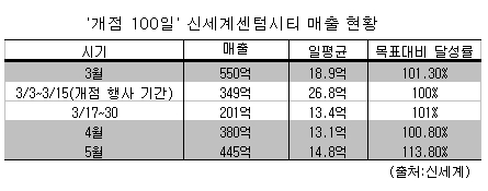 개점 효과가 사라지면서 4월엔 매출이 380억원으로 전월대비 30% 가량 줄었지만 목표대비 100.8%를 달성했고 '황금연휴'가 몰린 5월에 매출이 다시 늘면서 전월대비 매출이 17% 증가한 총 445억원으로 목표대비 113.8%를 달성했다.