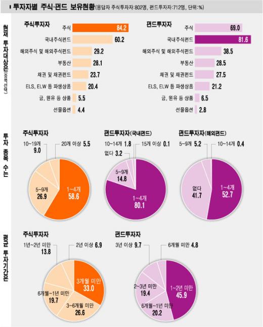 주식 투자 종목 수는 58.6%의 투자자들이 연간 1~4개였고 많아야 10개 미만(85.5%)이었다. 반면 펀드투자는 80.1%가 1~4개의 펀드를 보유하고 있는 것으로 조사됐다. 5~9개를 포함하면 94.8%에 달했다. 펀드는 많은 종목에 동시에 투자하는 경우가 대부분이라는 점을 감안하면 당연한 결과일 수도 있지만 펀드보다 위험도가 높은 주식을 보다 분산투자하려는 경향으로도 풀이할 수 있는 대목이다.