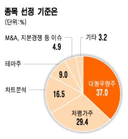`종목 선정기준은 무엇인가'라는 질문에 응답자 802명의 297명(37.0%)이 `대형 우량주'라고 답변했다. 이어 `저평가주'라고 대답한 사람이 236명(29.4%)이었다. 132명(16.5%)이 응답한 `차트분석'이 그 뒤를 이었다.
