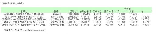 지난 15일 기준으로 '피델리티코리아증권자투자신탁N(채권)'이 마이너스 2.17%, 'KB장기주택마련증권투자신탁 1(채권)'이 마이너스 1.28%, '삼성ABF Korea인덱스증권투자신탁[채권](A)'가 마이너스 0.44%, '삼성장기주택마련증권투자신탁 1[채권]'과 '한국투자장기주택마련증권투자신탁 1(채권)'이 각각 마이너스 0.22%와 마이너스 0.16%를 기록했다.