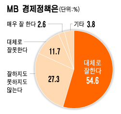 정부의 경제정책에 대해선 1년 전보다 긍정적이었다. 위기설의 촉매가 됐던 원/달러 환율 안정을 비롯해 경제팀의 호흡이 비교적 잘맞고 있다는 것이다. CEO 10명 중 6.7명꼴로 윤증현 경제팀이 '잘하고 있다'고 평가했다.