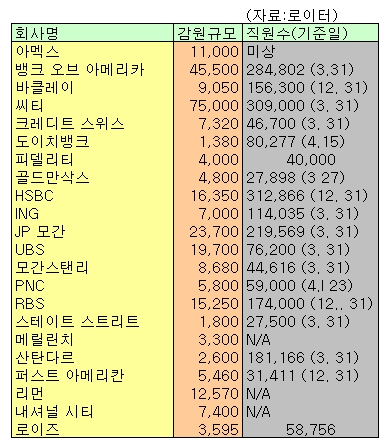회사별로는 씨티그룹이 7만5000명을 해고, 인력감축 규모가 가장 컸으며 이어 뱅크 오브 아메리카 4만5500명, J.P 모간 2만3700명 등 미국 은행들의 해고규모가 컸다.