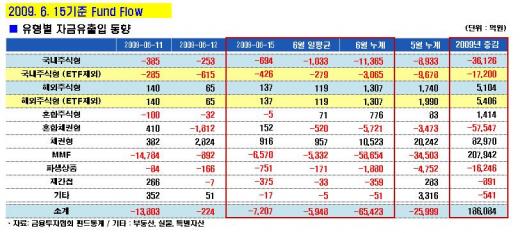한편 머니마켓펀드(MMF)에서는 6570억원이 빠져나갔고 파생상품펀드와 재간접펀드에서도 각각 751억원과 375억원이 순유출됐다. 채권형펀드와 혼합채권형펀드에는 916억원과 152억원이 순유입됐다.