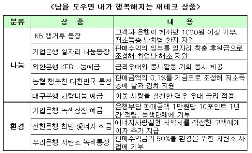 주요 은행들이 내놓은 일부 예금과 적금 상품에는 '남을 도우면 내가 행복해지는' 재테크 상품이 있다. 돈을 아끼면서 저금도 하고 일부 이자 등으로는 기부도 할 수 있는 상품이다. 뿐만 아니라 오히려 남을 도우면서 우대 이자까지 챙길 수 있는 상품도 있다.