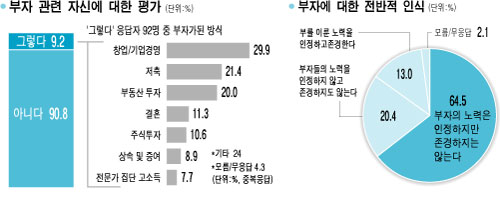 부자들의 재산형성 방법으로는 부동산 투자(70.2%)가 가장 많이 꼽혔고 △상속이나 증여(40.4%) △권력 소유(26.6%) △창업이나 기업경영(26.1%) △주식투자(13.3%) 등이 뒤를 이었다. '상속이나 증여'를 꼽은 비율은 2008년 34.8%에서 5.6%포인트 높아진 반면 '부동산 투자' 응답비율은 76.3%에서 6.1%포인트 하락했다. 정작 자신을 부자라고 본 이들은 창업이나 기업경영(29.9%)을 1순위로 꼽았다.