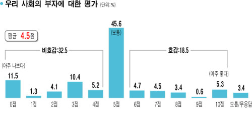 ◇'부자 비호감' 늘어='우리 사회의 부자를 평가해달라'는 질문(0∼10점)에 '보통'이라는 의미의 5점을 준 응답자가 45.6%로 가장 많았다. 그러나 비호감을 뜻하는 0~4점 답변(32.5%)이 호감을 나타내는 6~10점 응답(18.5%)보다 많았다. 평균은 4.5점으로 집계됐다. 평균점은 2006년 5.28점으로 5점을 넘었으나 2007년 4.99점으로 떨어진 뒤 해마다 내려가고 있다.