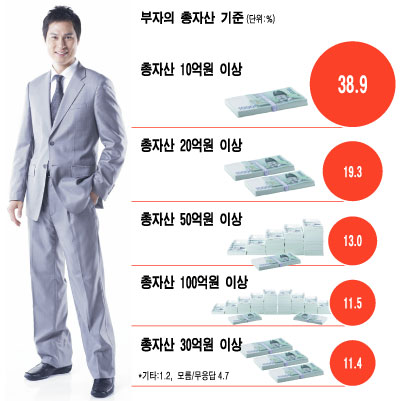 금융자산이나 부동산을 모두 포함해 재산이 얼마나 있어야 부자인지 묻자 '총자산 10억원 이상'이 38.9%로 가장 높았다. 그뒤를 △20억원 이상(19.3%) △50억원 이상(13%) △100억원 이상(11.5%) 등이 이었다. 총자산 10억원을 부자의 기준으로 삼는 인식은 지난해와 다르지 않았다.
