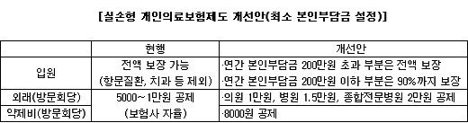 개선 방안에 따르면 개인 실손 의료 보험의 보장 범위가 현행 100%에서 90%로 축소된다. 대신 최소 본인 부담금 제도가 도입된다. 예컨대 입원비중 본인부담금이 2000만원이 나왔다고 가정할 때 현재는 2000만원 전액을 보장받을 수 있지만 앞으론 200만원을 개인이 내야 한다. 3000만원의 경우에는 90% 실손 보장을 받아 300만원이 개인 몫이 되지만 200만원 기준이 도입돼 2800만원까지 보장을 받을 수 있다.
