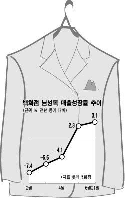 22일 롯데백화점에 따르면 남성 정장 매출(전점 기준)은 2월(-7.4%), 3월(-5.6%), 4월(-4.1%)까지 내리 역신장하다 5월에 2.3% 신장세로 돌아섰다. 6월(21일까지) 들어서는 매출이 3.1% 증가해 신장폭이 더 커졌다. 남성 정장 매출이 역신장의 늪에서 벗어난 것.