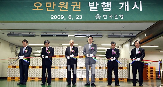 이성태 한은 총재를 비롯한 관계자들이 23일 오전 한국은행 본관 지하 1층 현송장에서 1973년 1만원권이 발행된 이후 36년만에 첫 선을 보인 5만원 고액권의 발행을 알리는 테이프 커팅을 하고 있다.